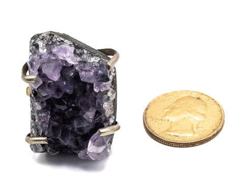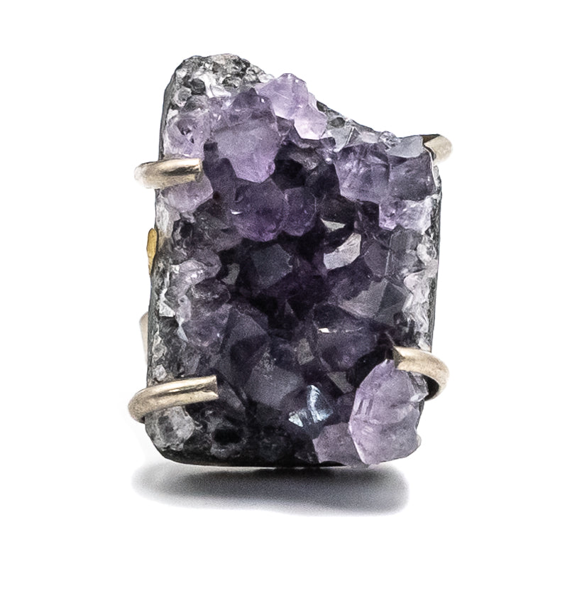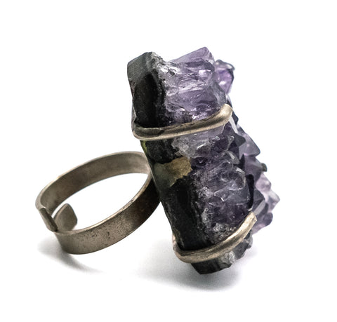 Amethyst stone.  In alpaca silver. It are adjustable. The properties of Amethyst crystal  are deeply connected to the third eye chakra, the center of spirituality and intuition, and the crown chakra, the chakra that governs our connection to the universe. The purple crystal meaning of Amethyst is associated with energy centers. This helps to explain why Amethyst crystal is such a powerful stone to balance, open, and activate the third eye and crown chakras.
