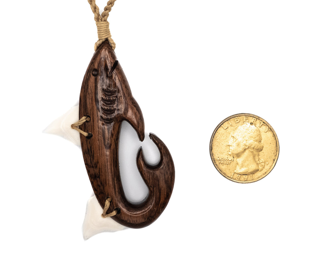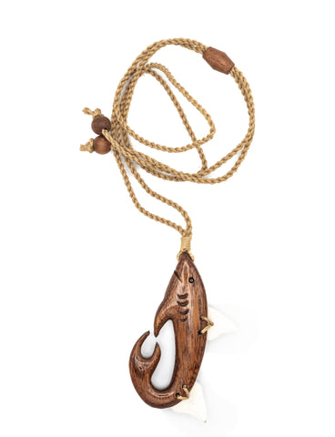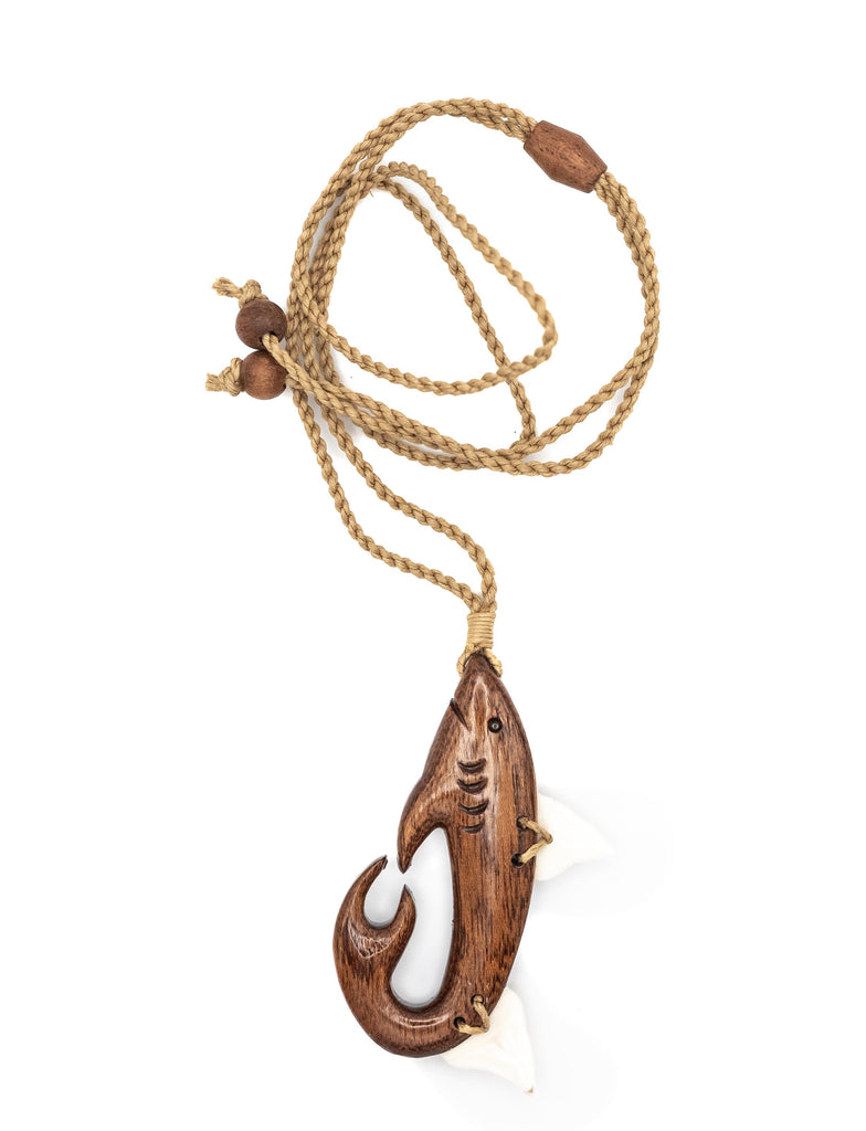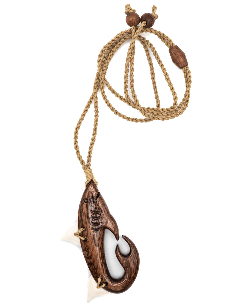 HAND-CARVED HOOK IN KOA WOOD WITH SHARK TOOTH . WOVEN WITH WAXED THREAD